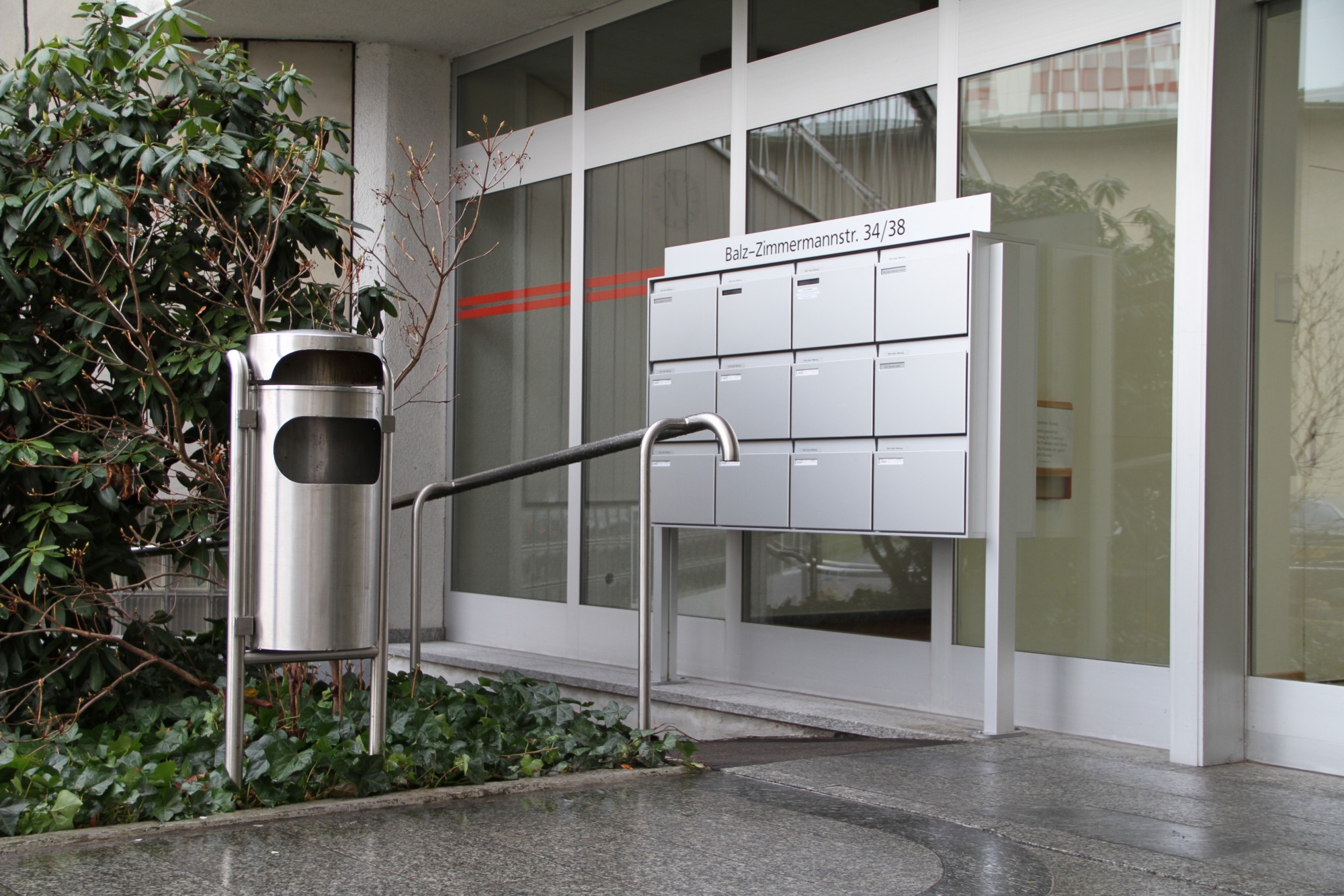 Die Bauherrschaft entschied sie für das Modell 305 INOX-line mit einem Fassungsvolumen von 30 Litern. Der Abfallbehälter ist mit dem Rohrrahmen entweder mit Bodenplatten zum Aufdübeln erhältlich oder zum Einbetonieren. Zum Entleeren wird der Behälter ausgeschwenkt und mit einem 3-Kt.-Schlüssel verriegelbar.